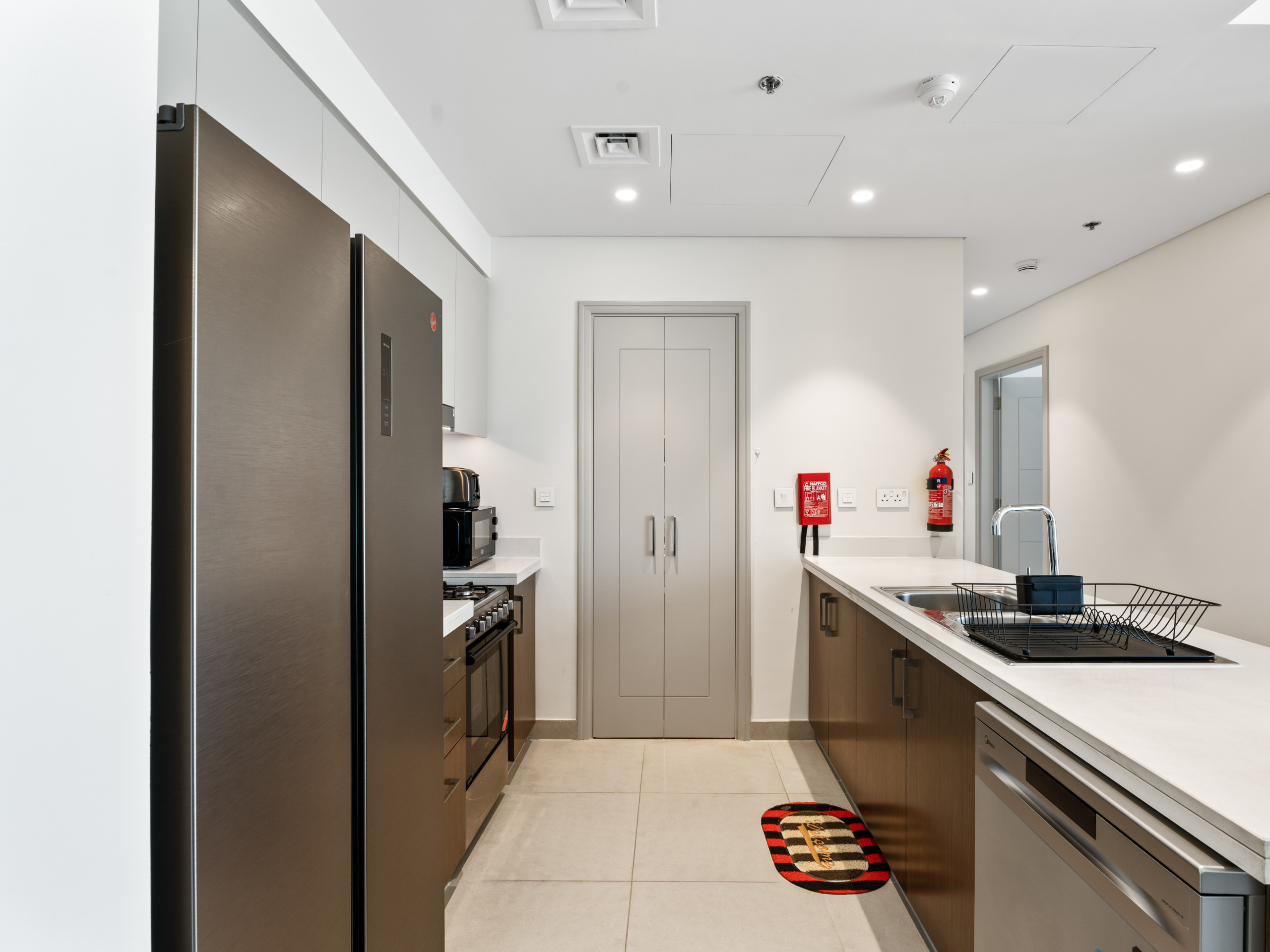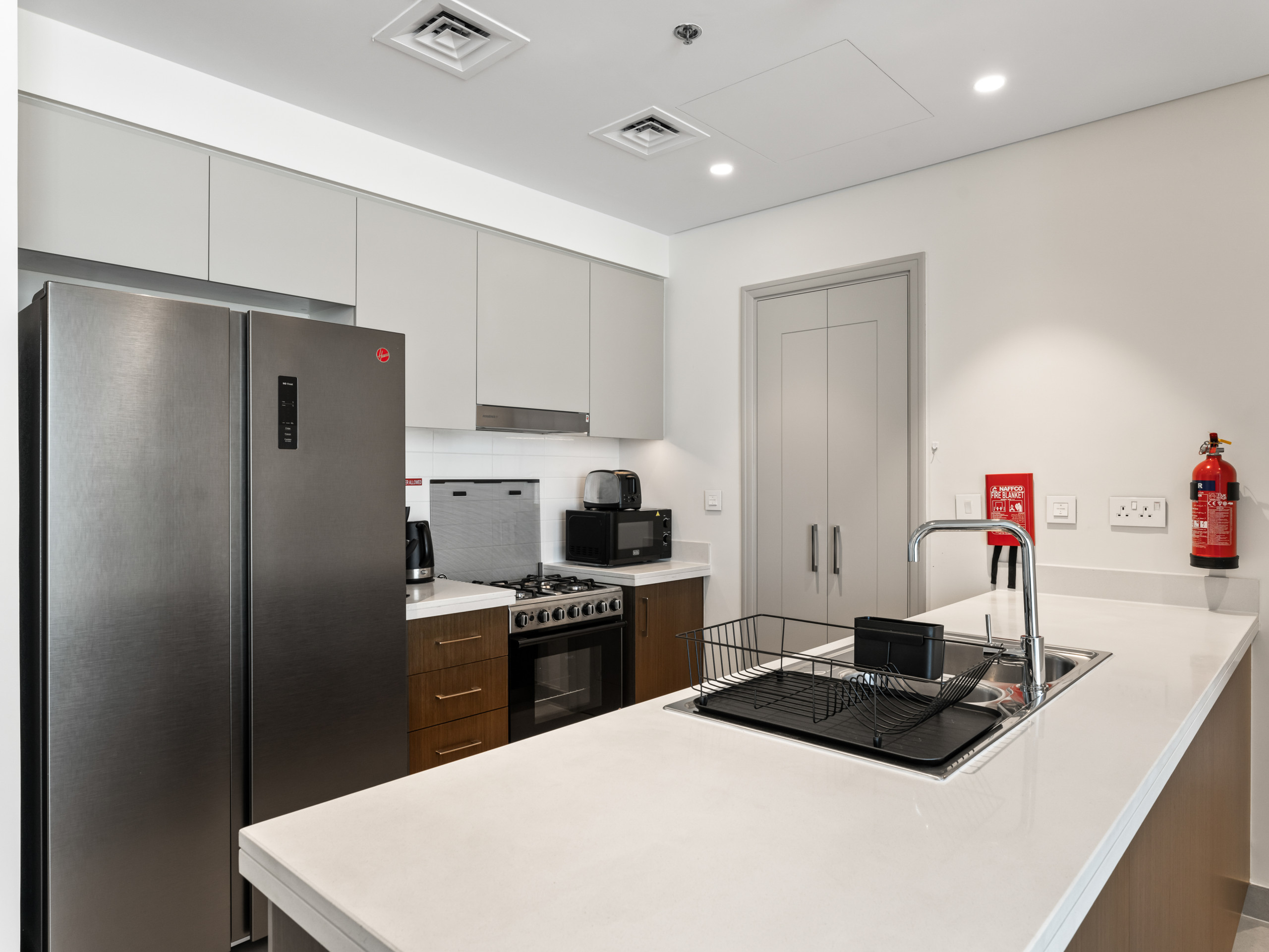 Fully Equipped Kitchen with appliances including a stove, microwave, fridge, and washing machine