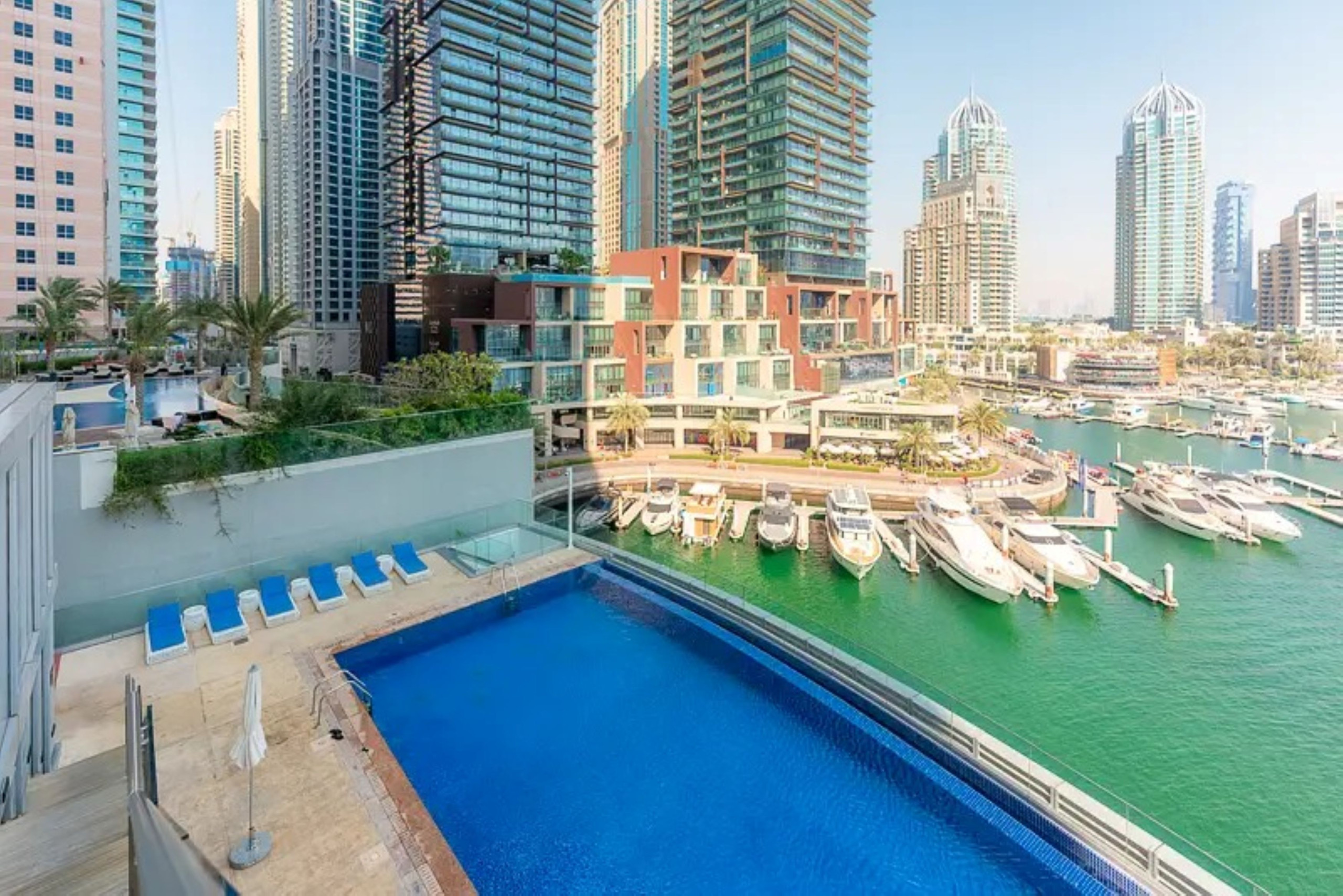 Rooftop infinity pool with panoramic marina views