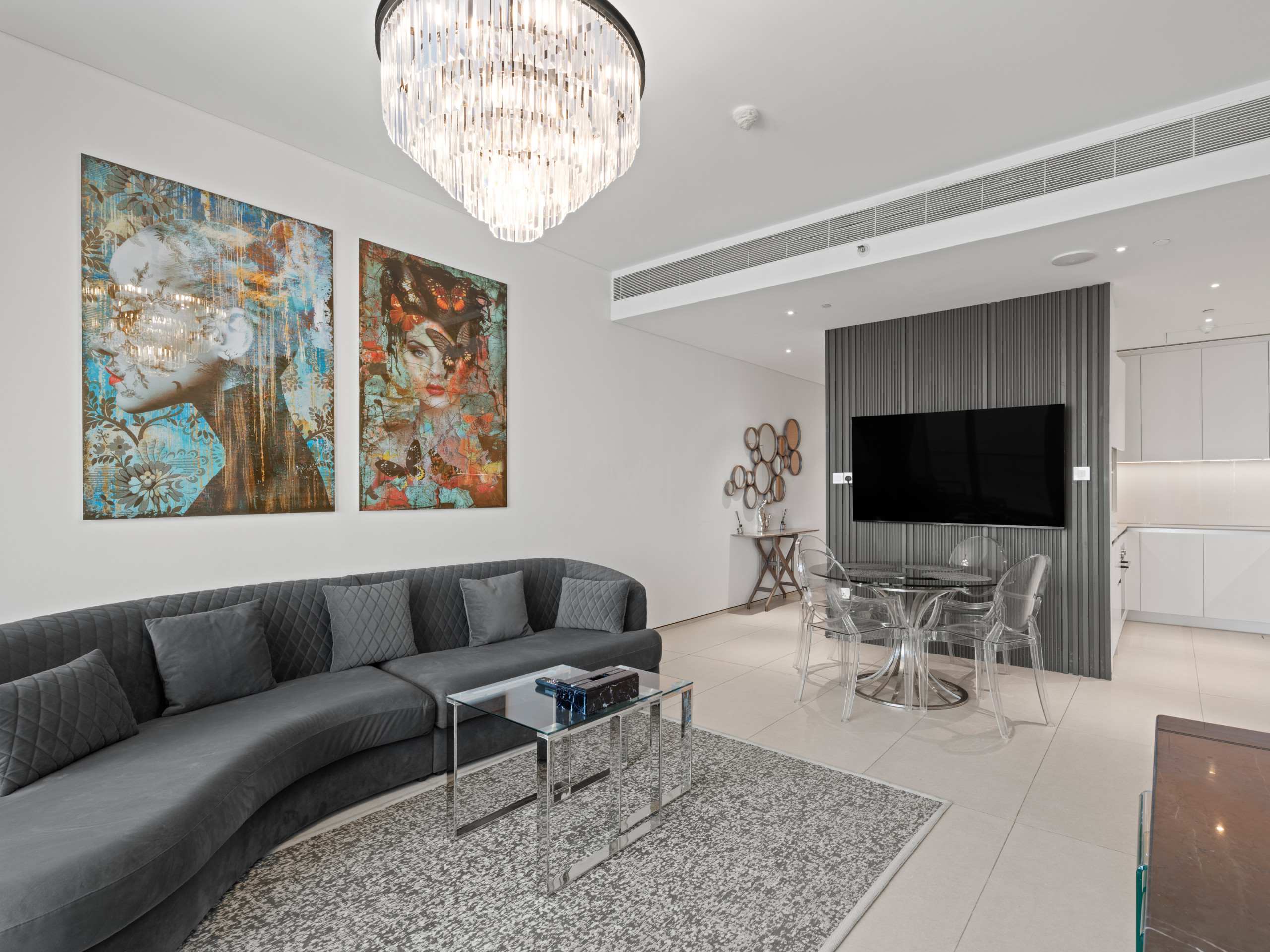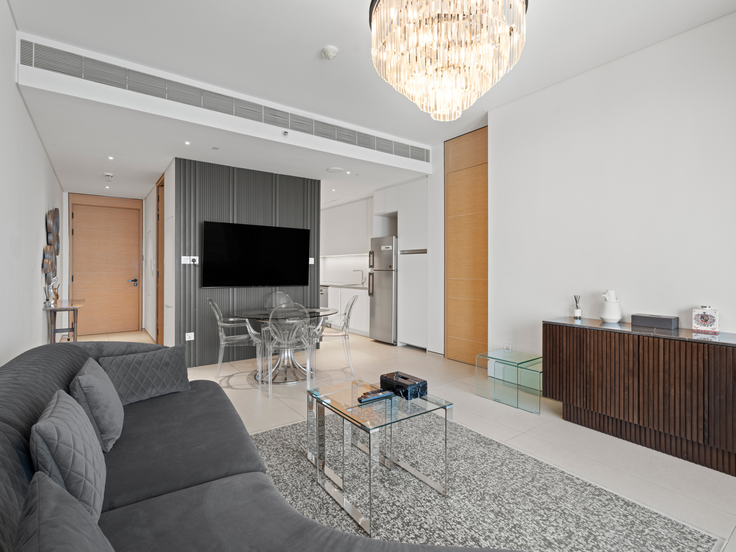 This exceptional residence seamlessly blends luxury with contemporary comfort, creating a warm and inviting atmosphere—perfect for families or friends. The living area features a plush sofa paired with a designer coffee table, ideal for relaxing while enjoying the television.