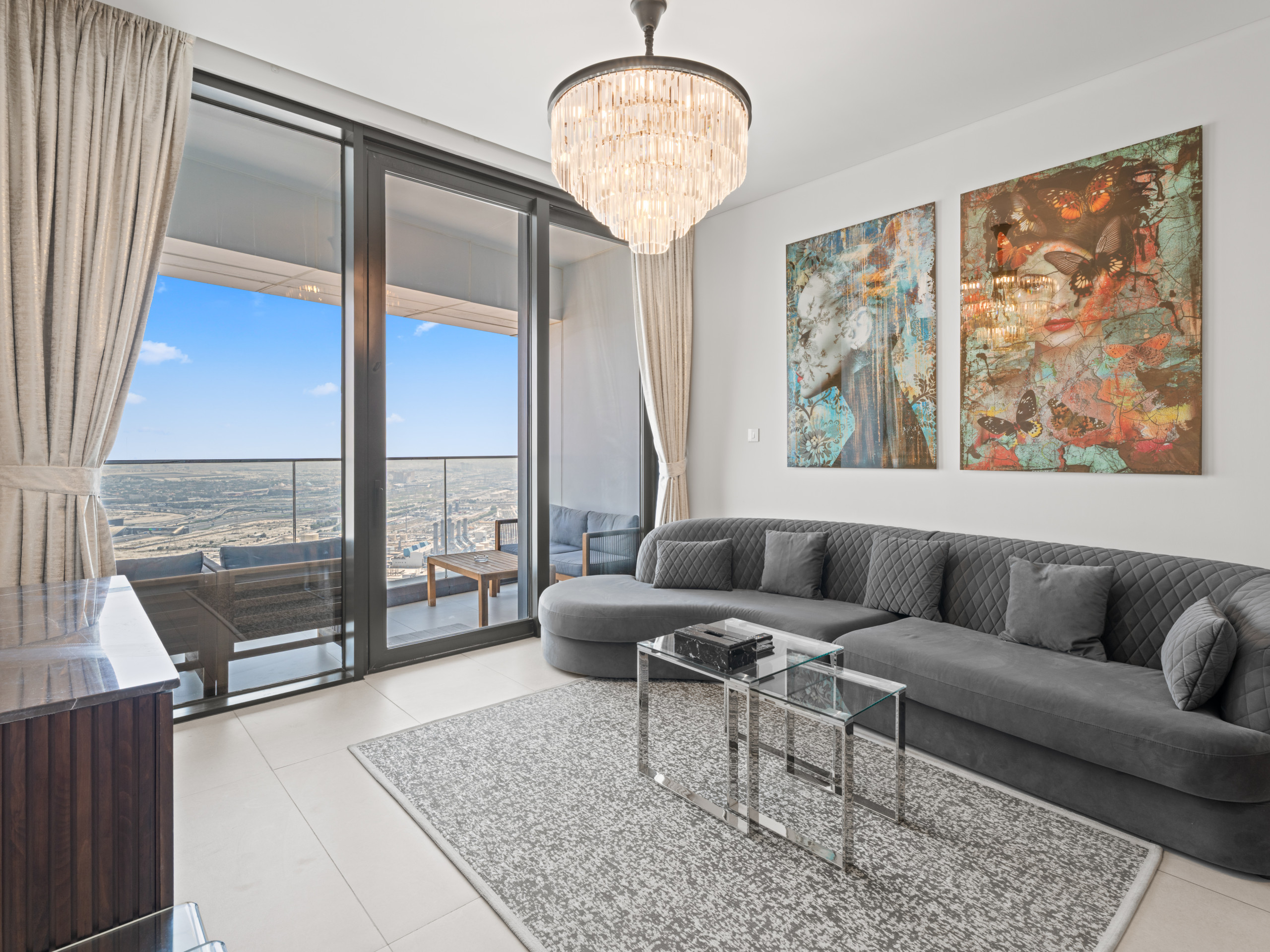 * Fully furnished living room with sofa, TV, and balcony access