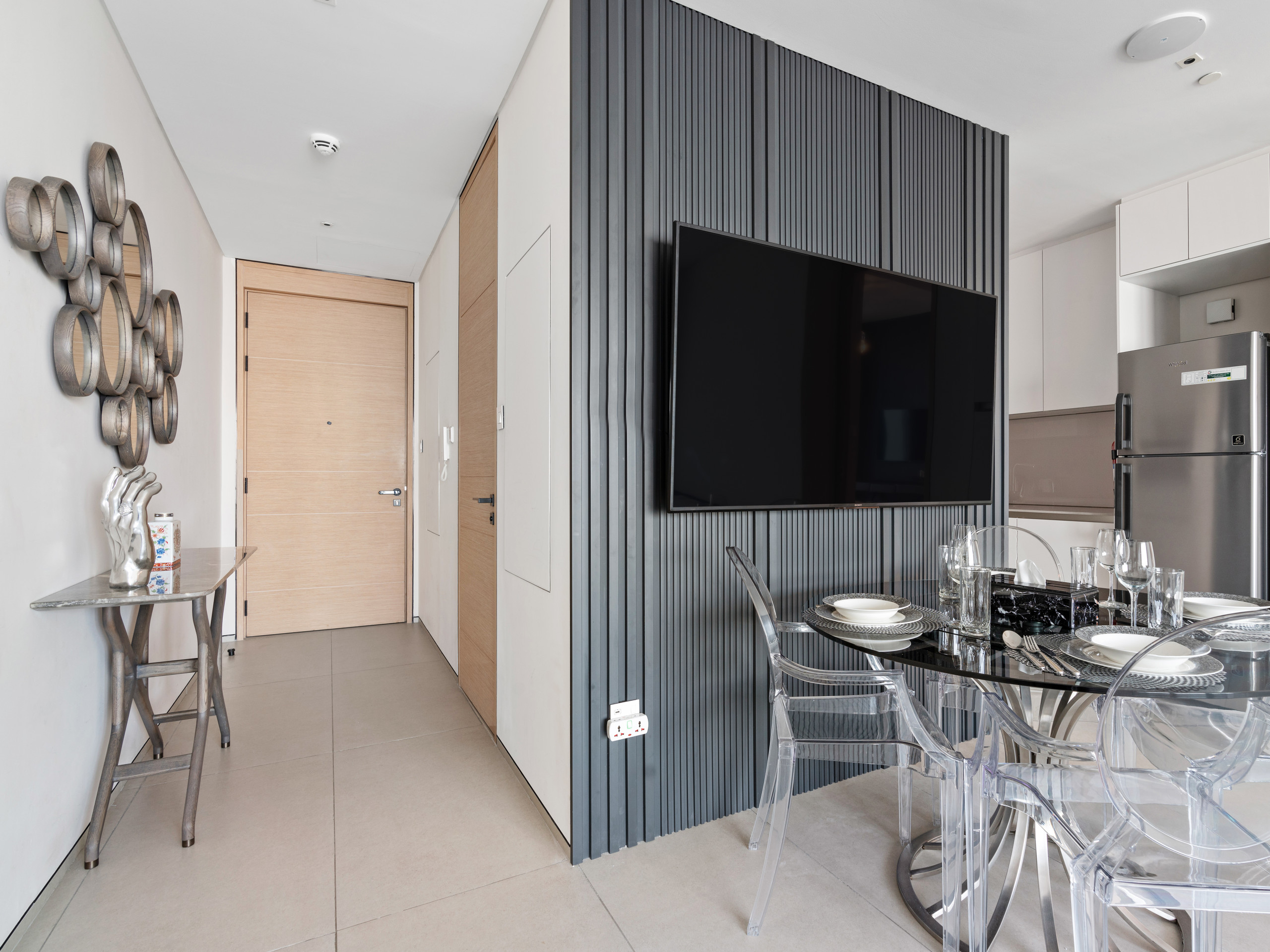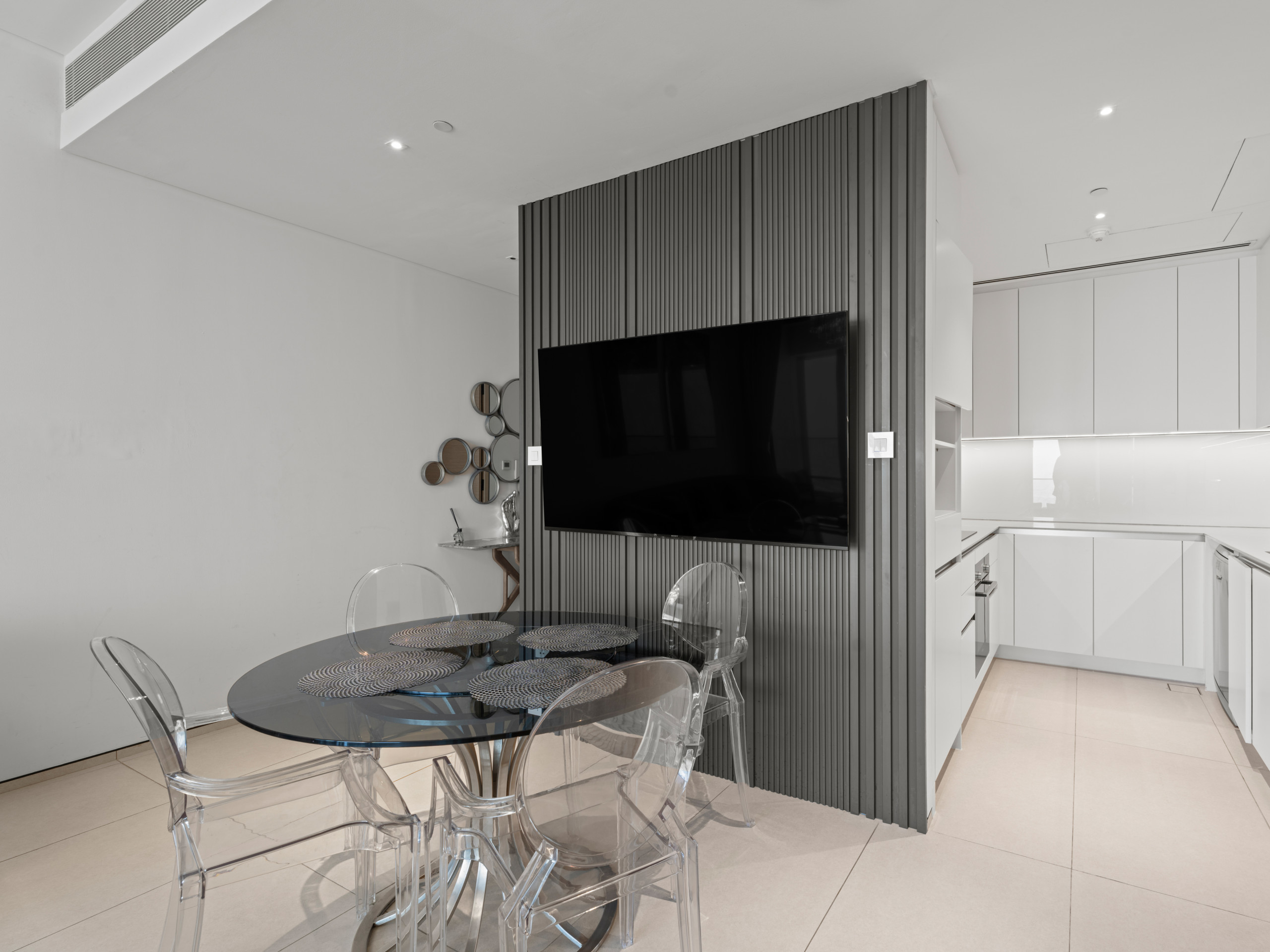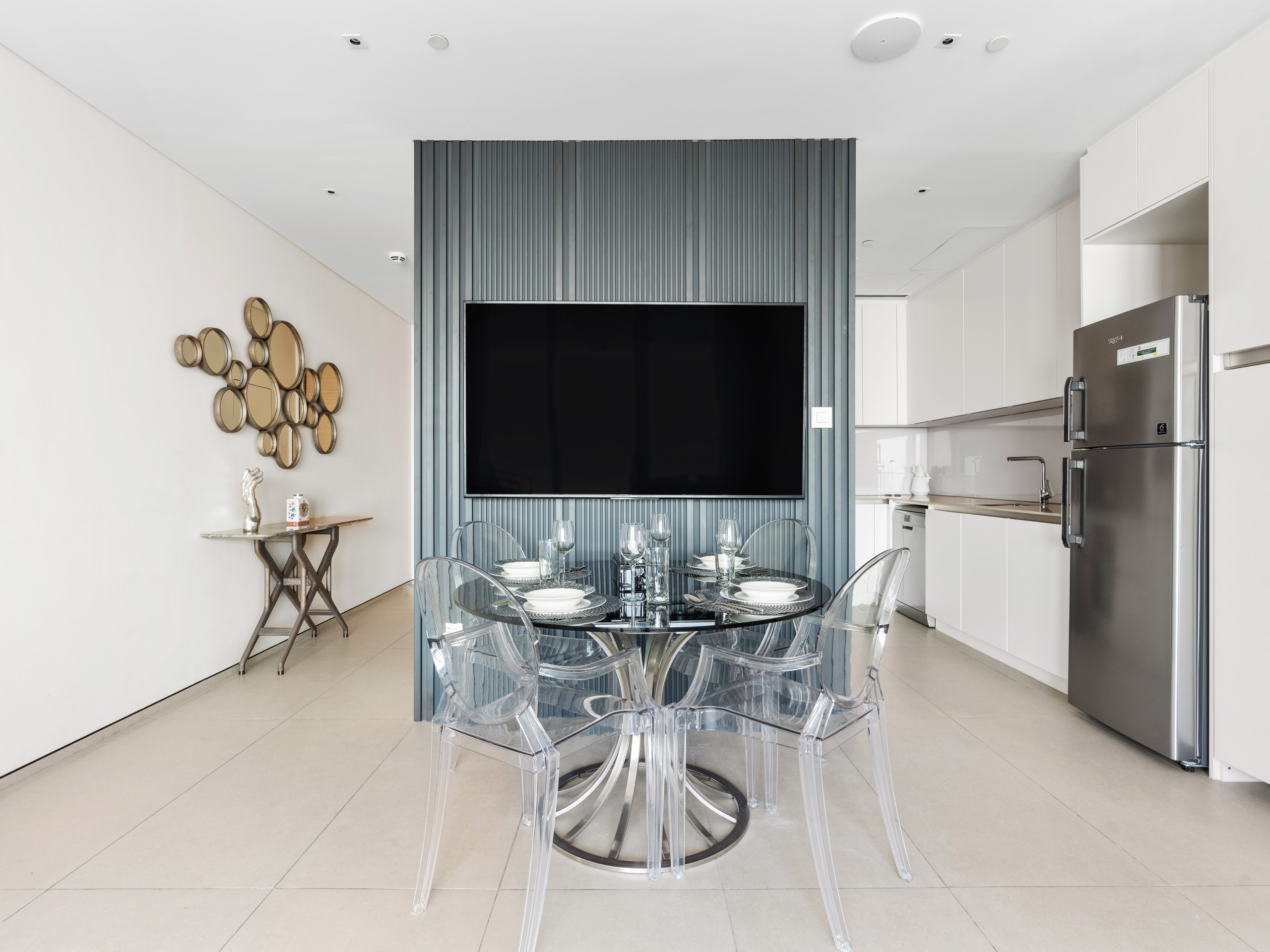 The fully equipped, state-of-the-art kitchen includes all essential appliances for preparing or reheating meals. A stylish dining table comfortably seats four guests, making it perfect for shared dining moments.