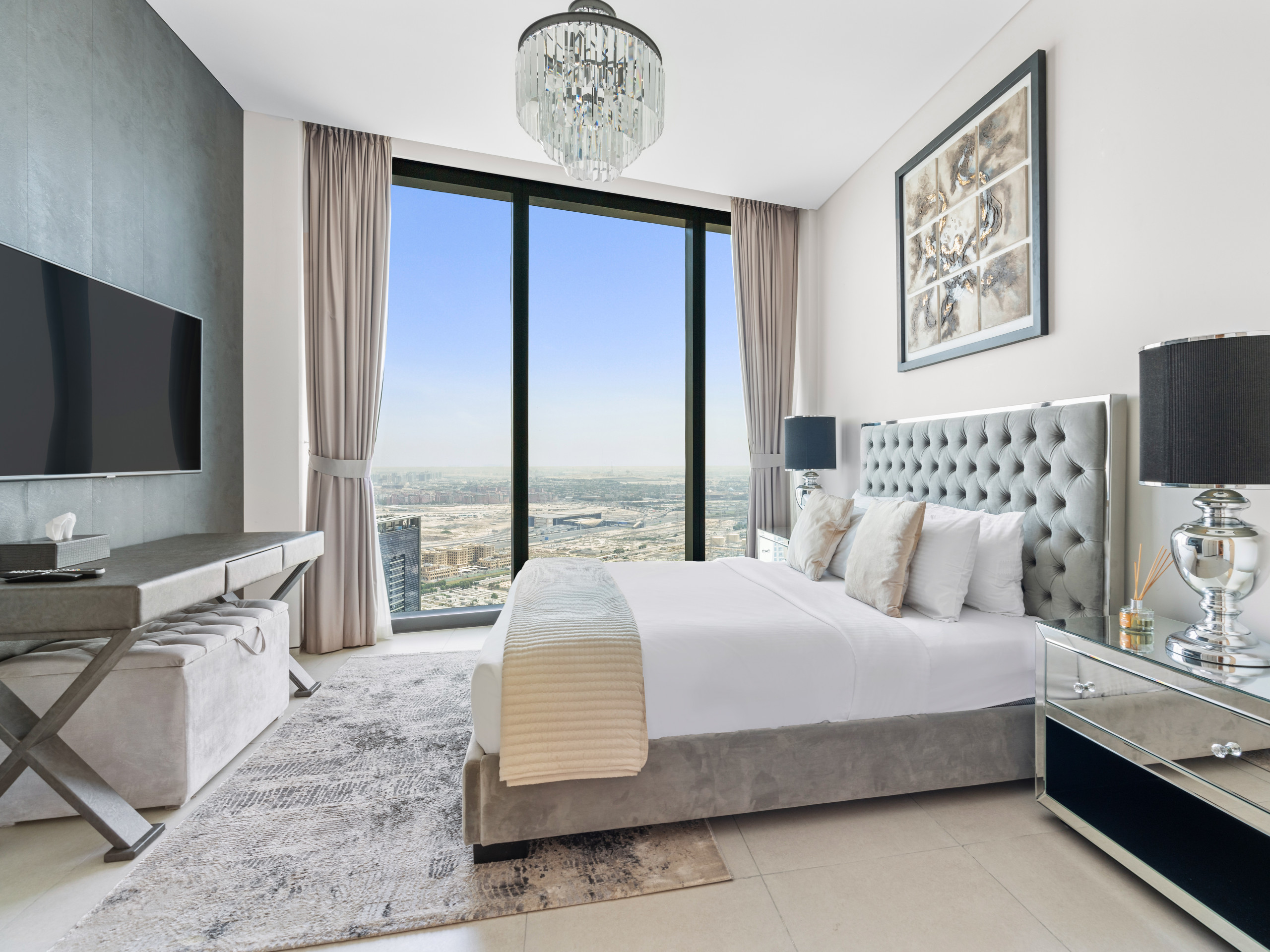 The master bedroom is designed for ultimate relaxation and restful nights. It features a queen-sized bed with premium linens, elegant bedside tables, and a spacious wardrobe. Natural light fills the room through the large window, offering beautiful views of Dubai Marina Wharf and the surrounding cityscape—perfect for enjoying your morning coffee.