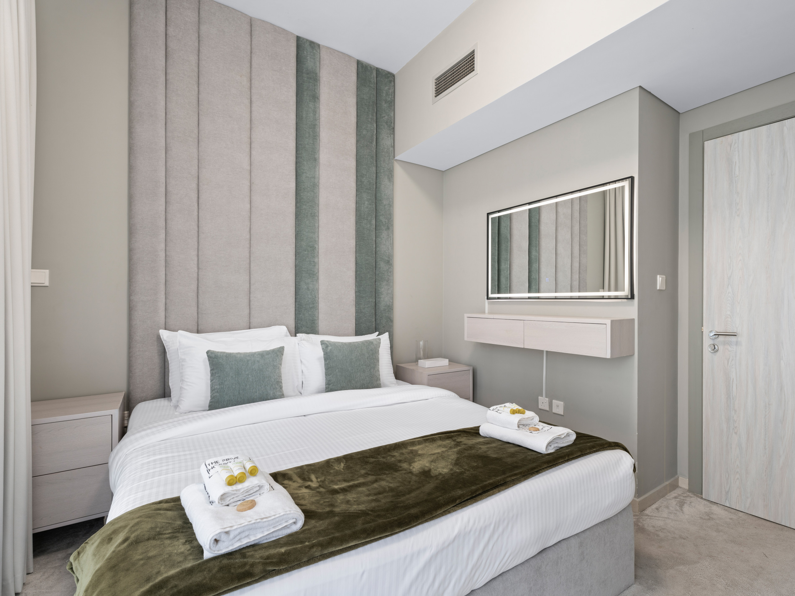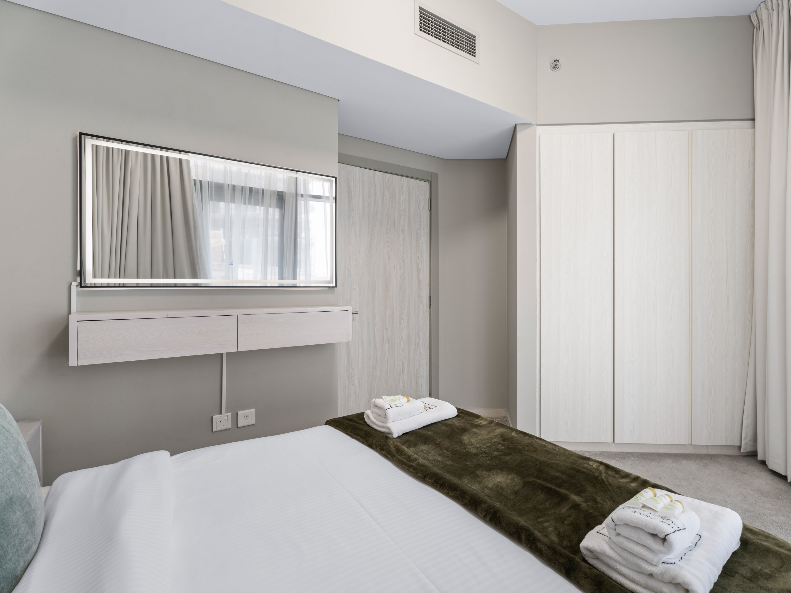 * Spacious bedroom with premium linens and built-in wardrobes