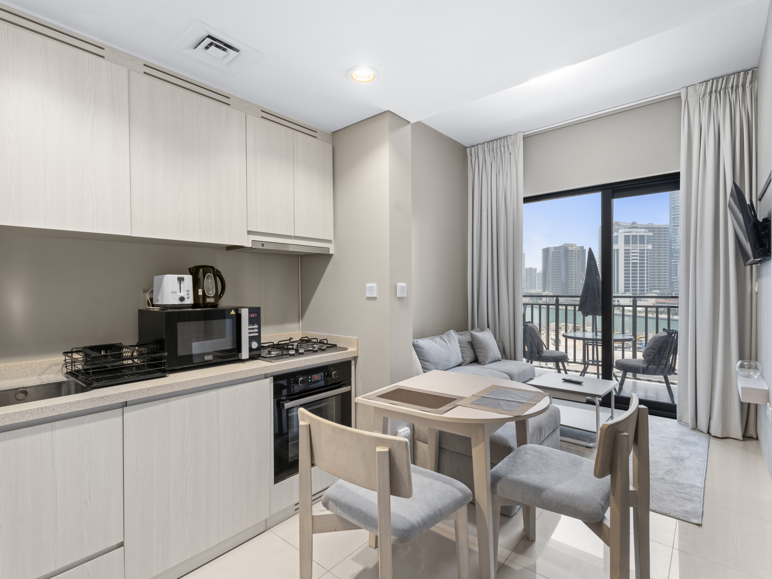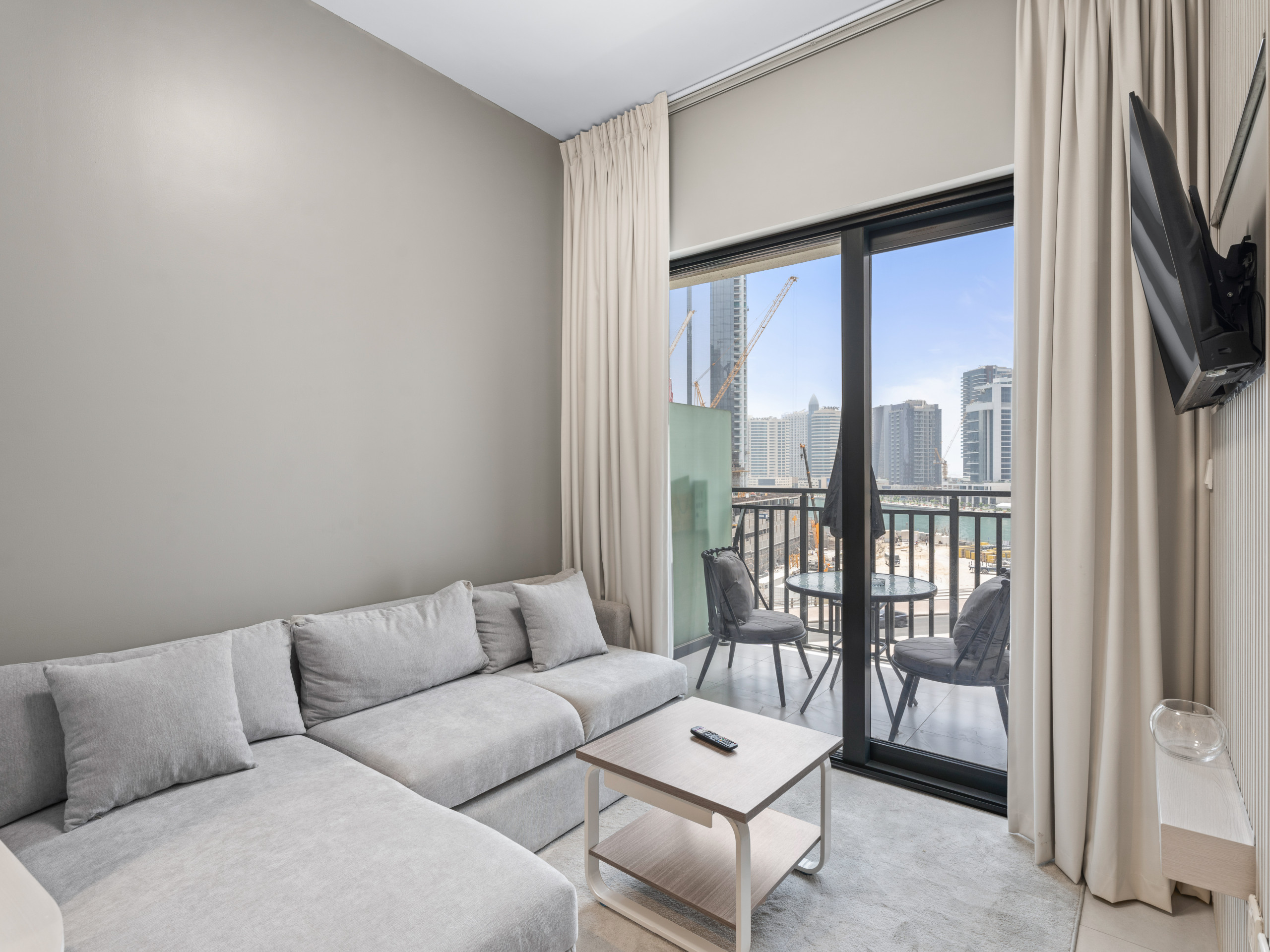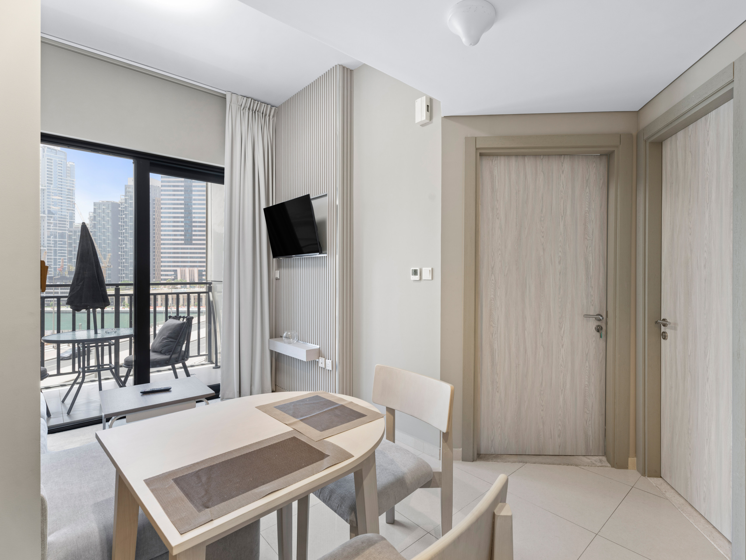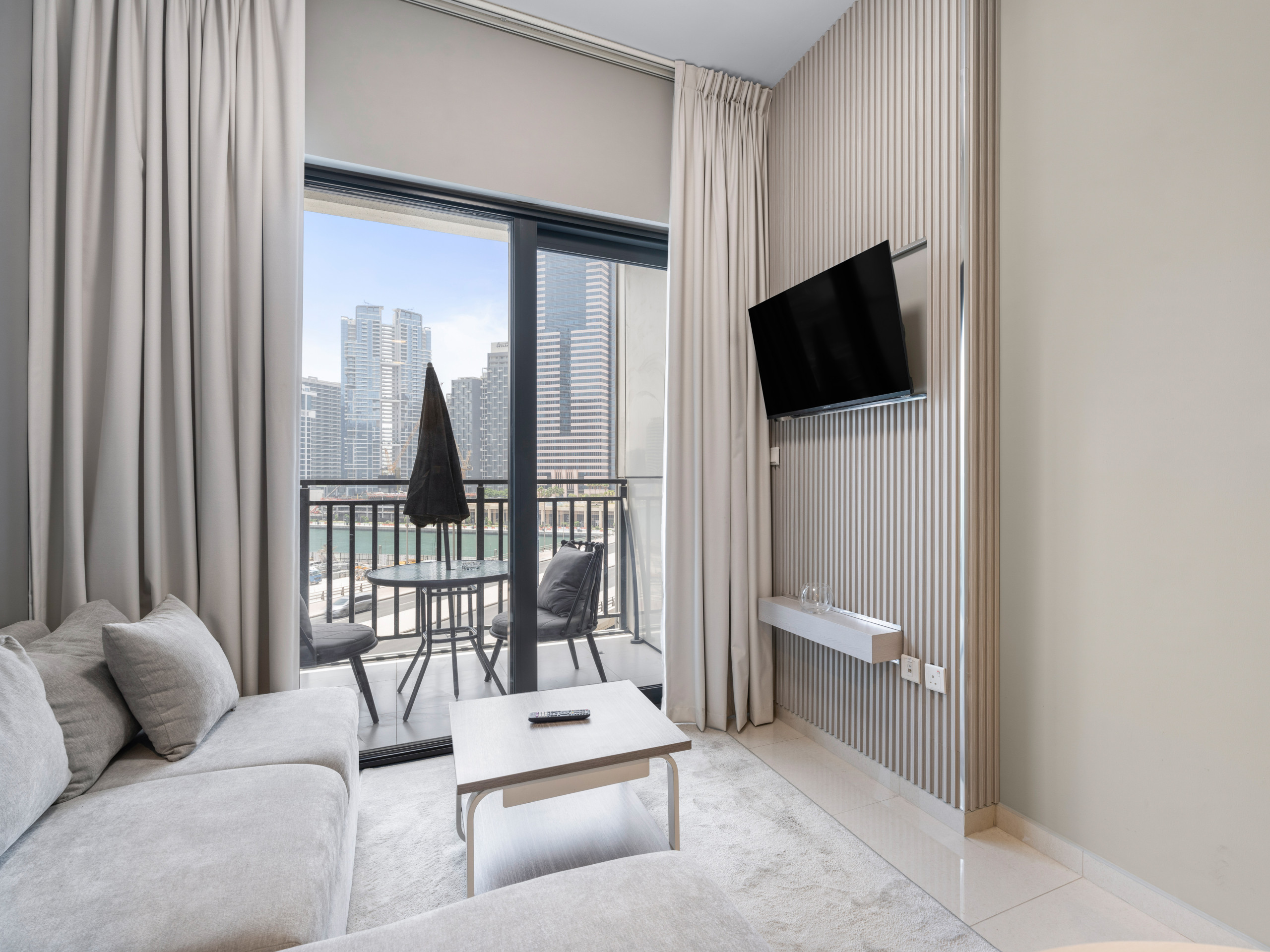 * Fully furnished living room with sofa, TV, and balcony access