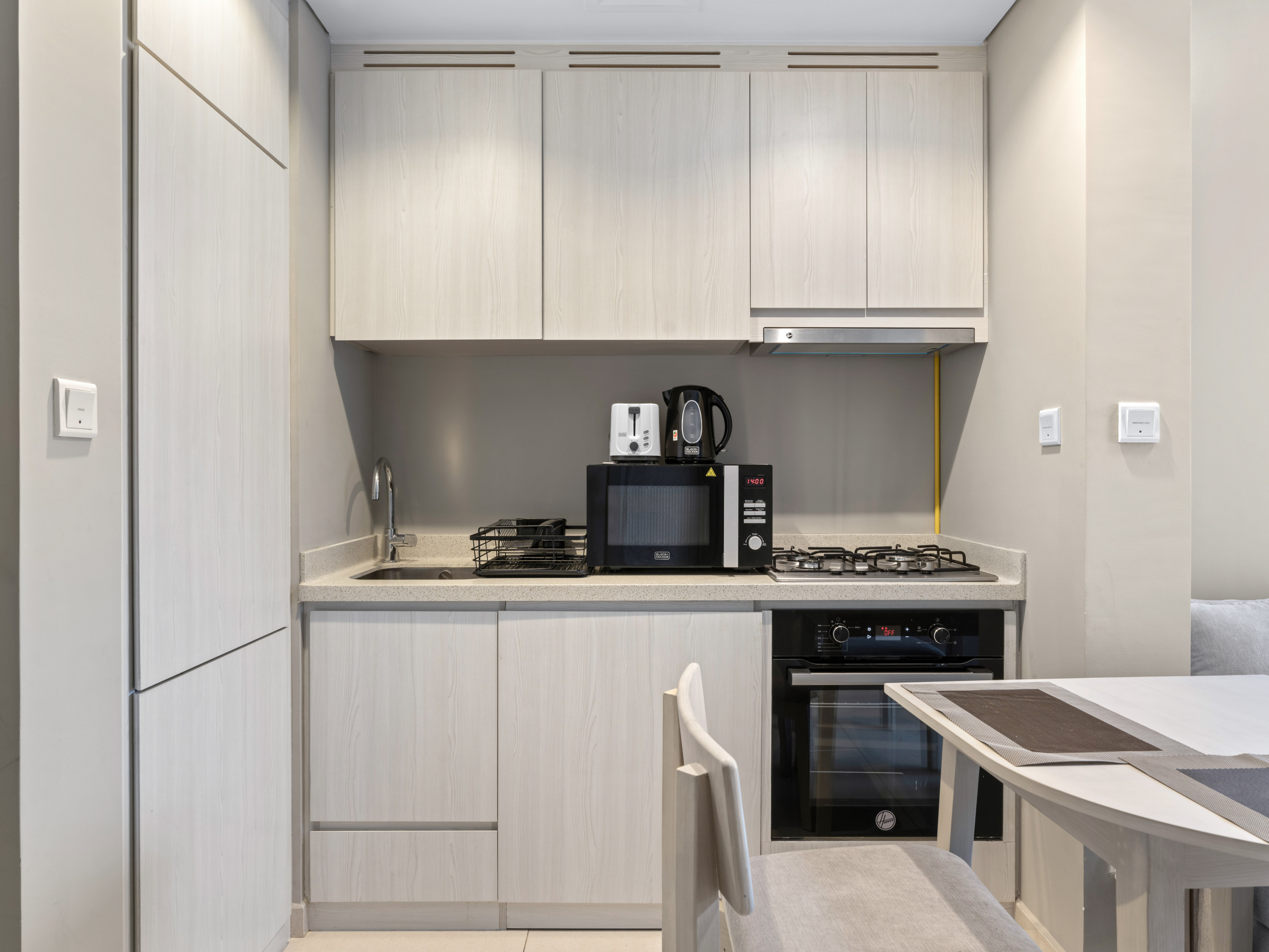 * Modern kitchen with appliances, cookware, and dining essentials
