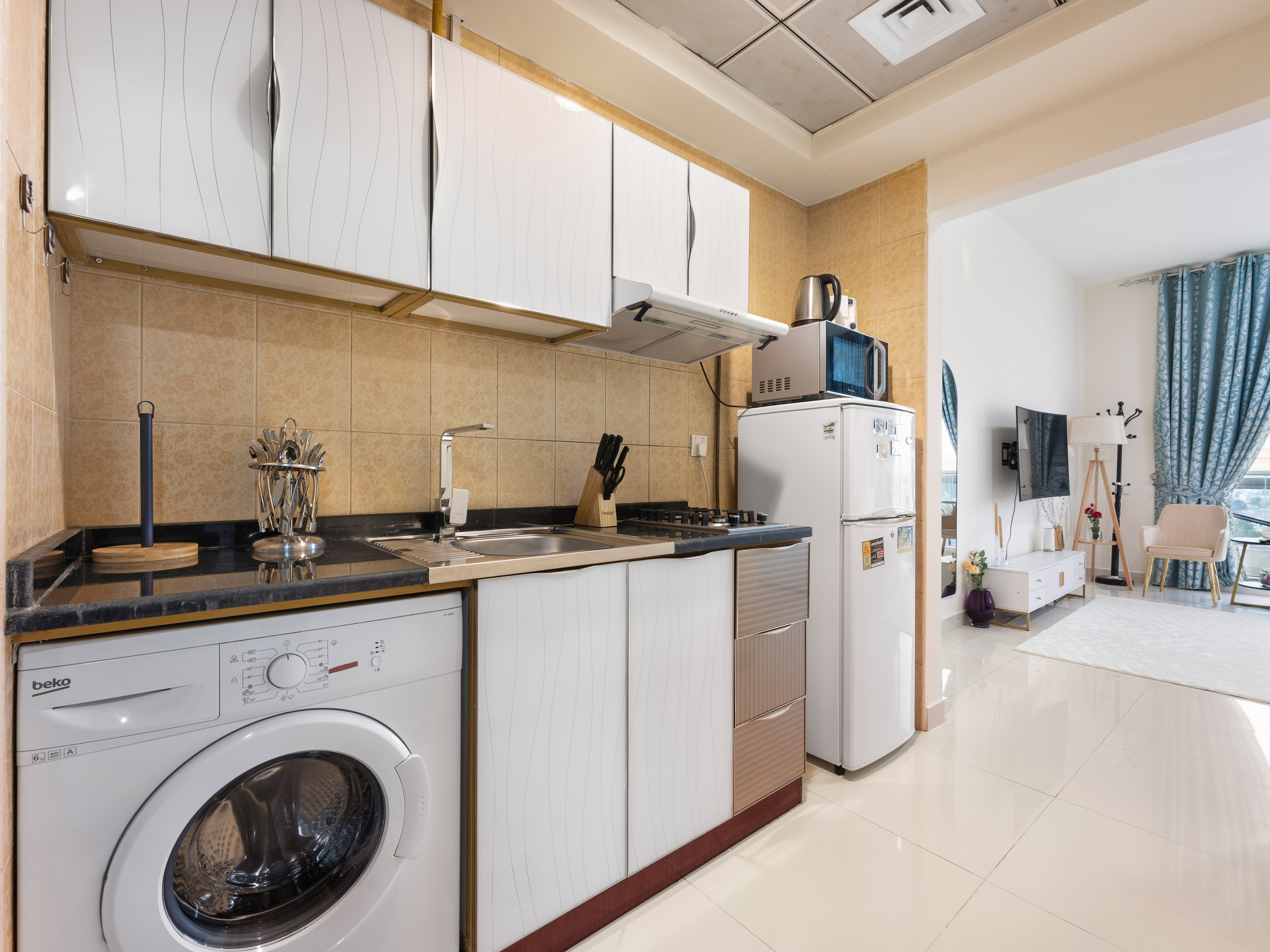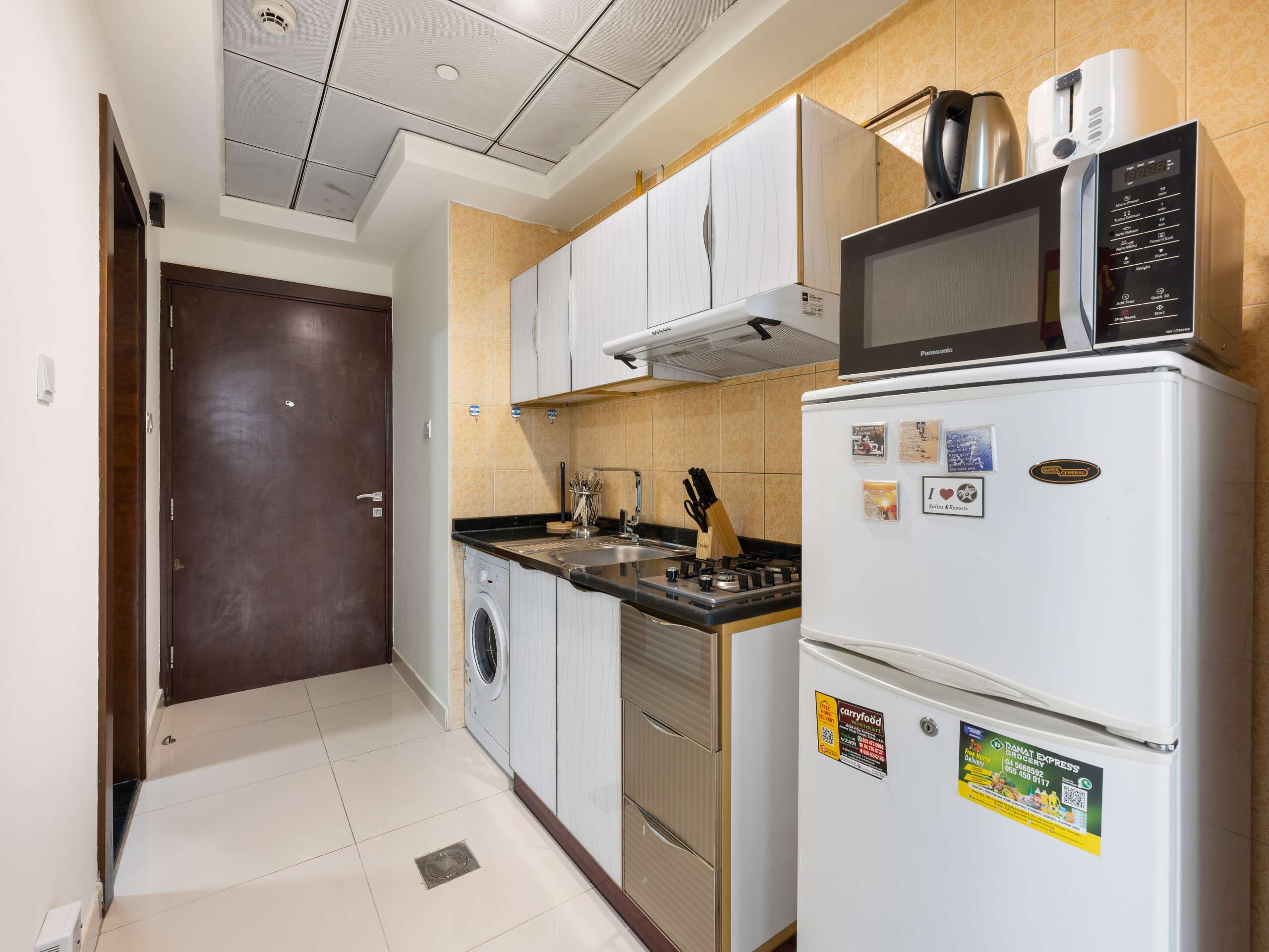 * Fully equipped kitchenette with Hot plate, Microwave, Fridge , Washing Machine.